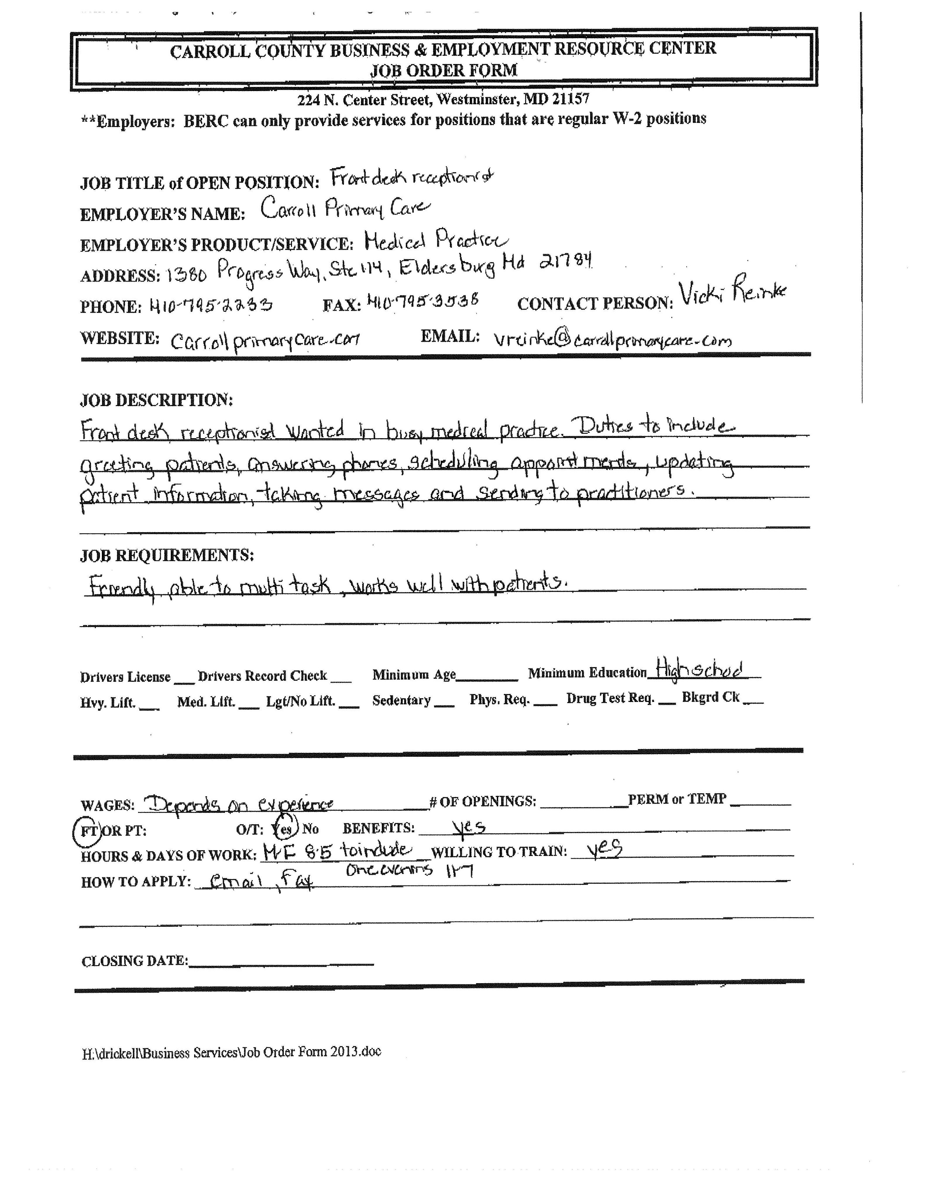 Carroll County Workforce Development On Twitter Hiring Front Desk Receptionist Full Time With Benefits Carroll Primary Care Eldersburg Maryland Https T Co Xywc9cshgb Twitter